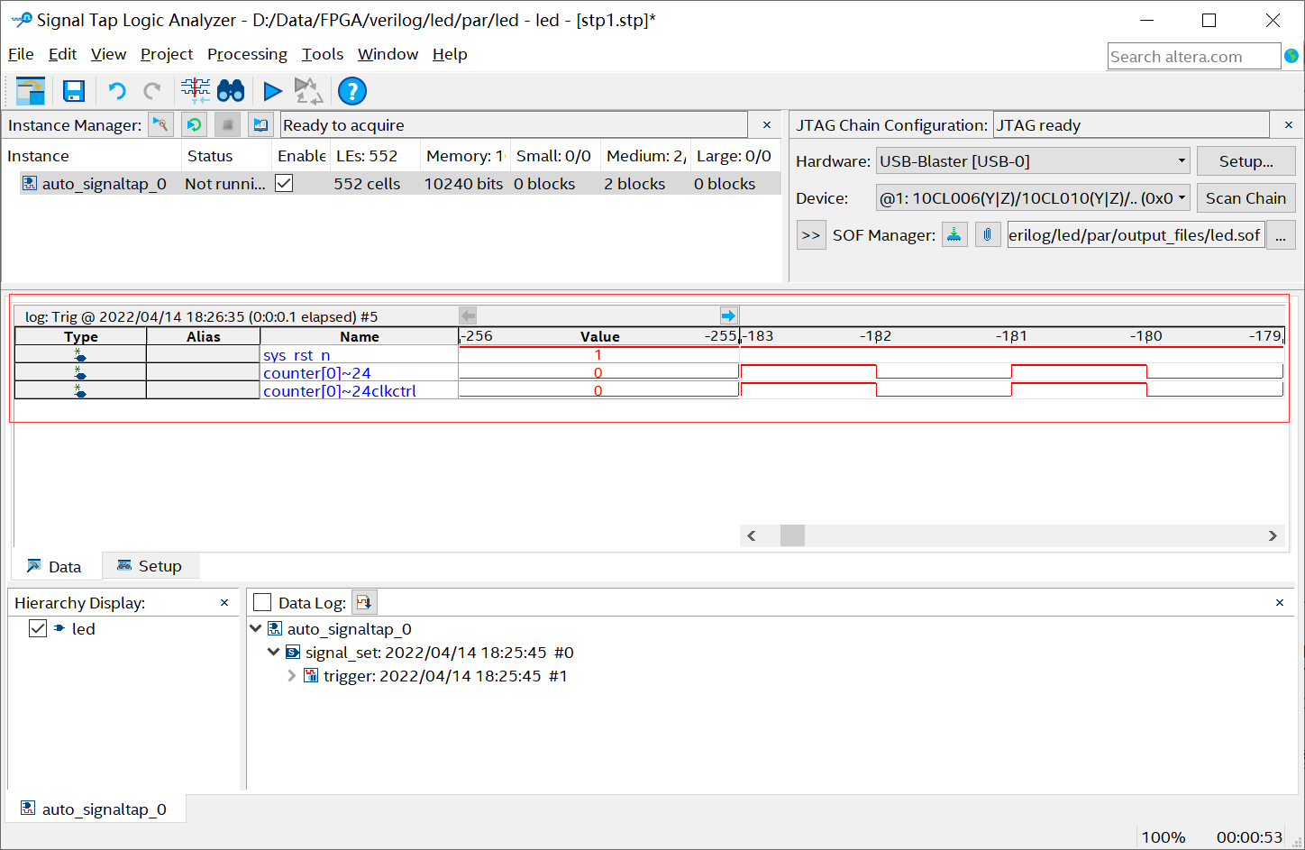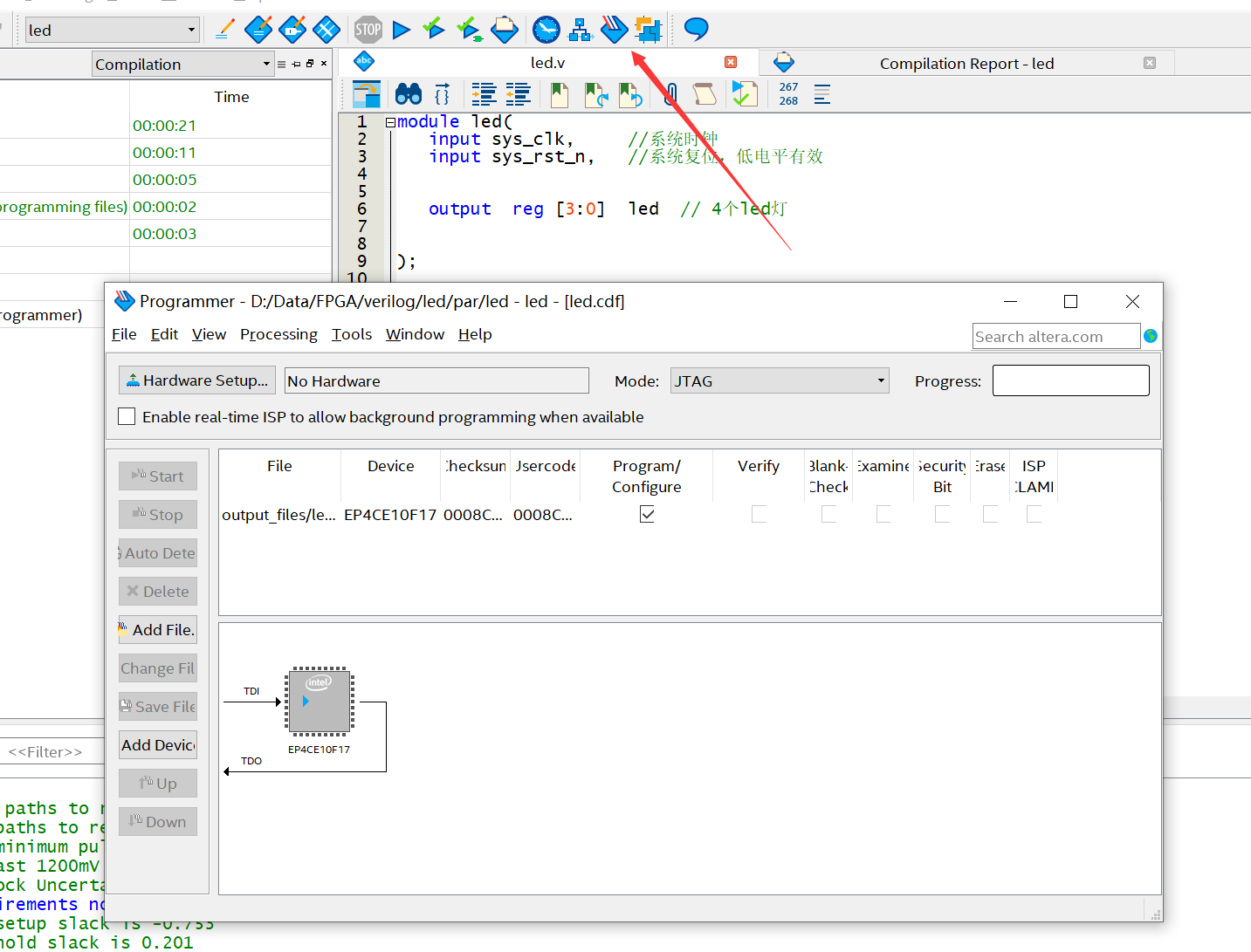 接下来需要对工程进行全编译, 全编译的工具栏图标, 开始编译工程。工程编译完成后,连接开发板,回到SignalTap软件界面。