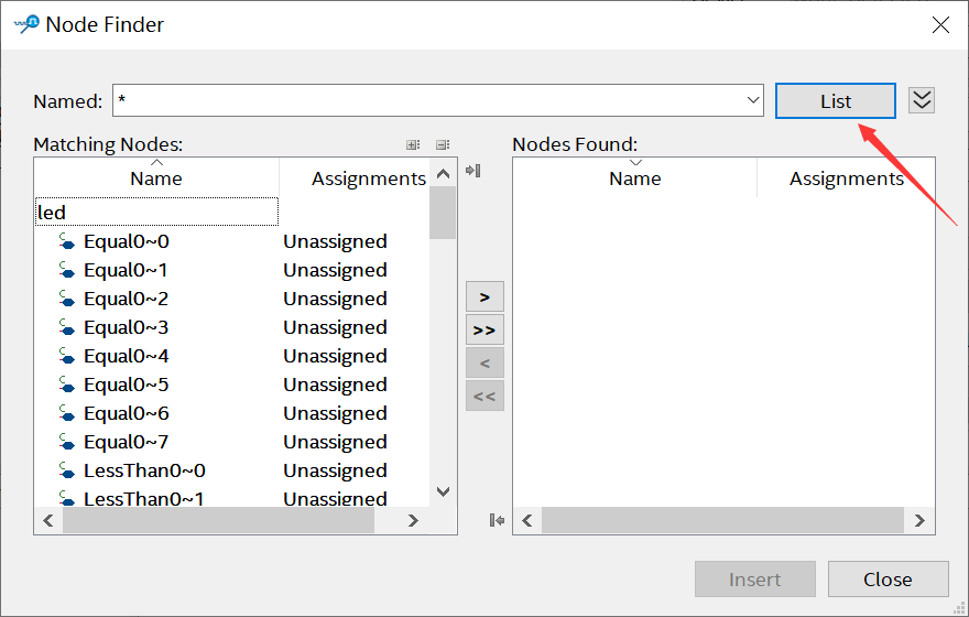点击【 List】按钮,此时Nodes Found一栏就会出现工程代码中的信号,然后将counter、sys_rst_n和led添加至右侧一栏中,添加方法是直接双击左侧一栏的信号名,如果需要删除的话,可以直接双击右侧一栏的信号名, 接下来我们点击【 insert】按钮。