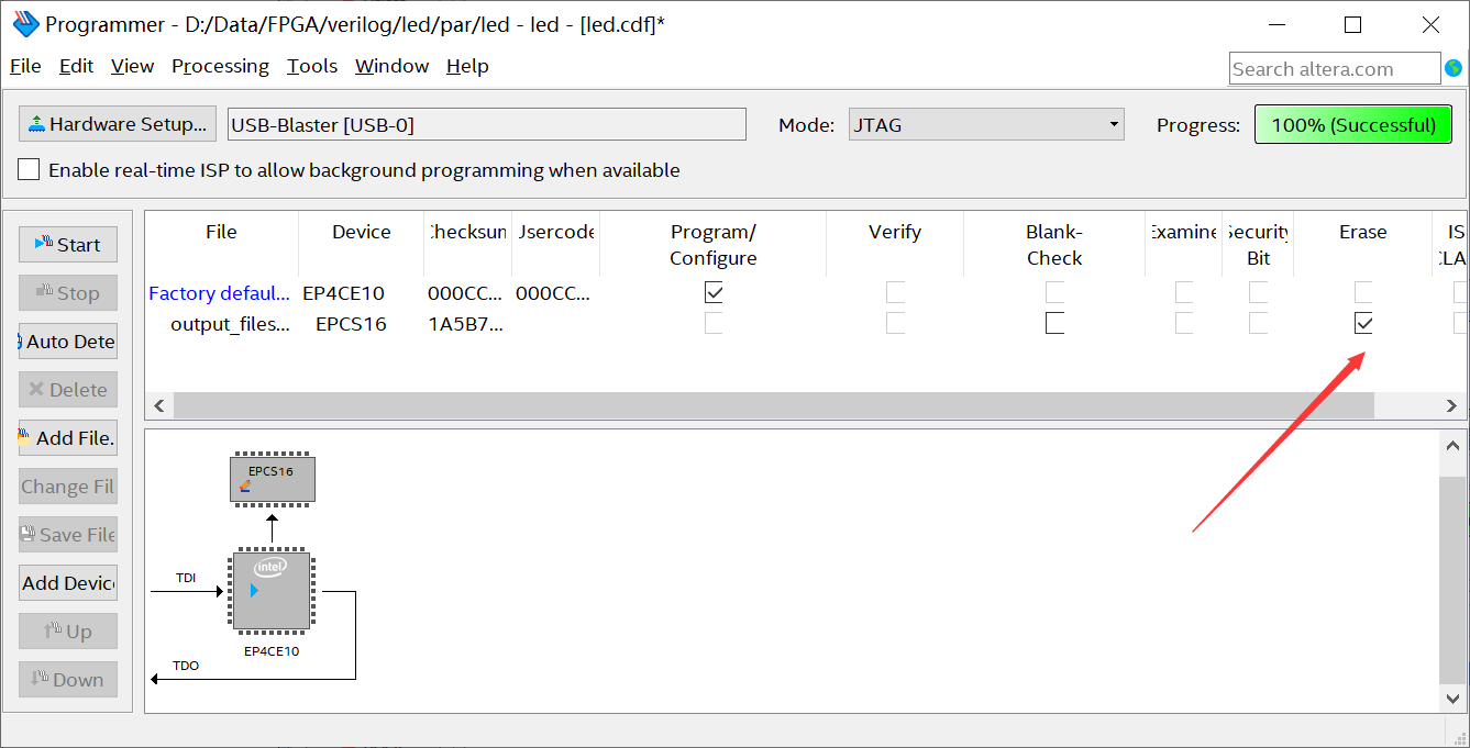 如果需要擦除Flash中的程序的话, 可以通过勾选【 Erase】下面的方框来擦除程序。需要注意的是,如果已经勾选了【 Program/Configure】方框,是无法勾选【 Erase】方框的,所以先取消勾选【 Program/Configure】,然后再勾选【 Erase】。