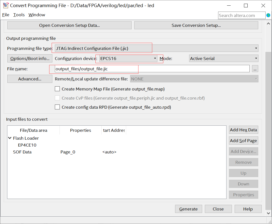 首先修改“ programming file type”为【 JTAG Indirect ConfigurationFile (.jic)】;然后修改“ Configuration device”为【 EPCS16】 (开拓者开发板Flash型号为M25P16,完全兼容EPCS16);