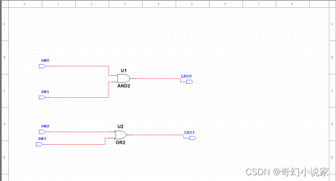 添加SW0、SW1、SW2、SW3、LED0、LED1,按要求连接如下图所示: