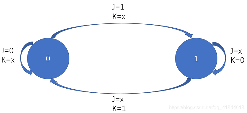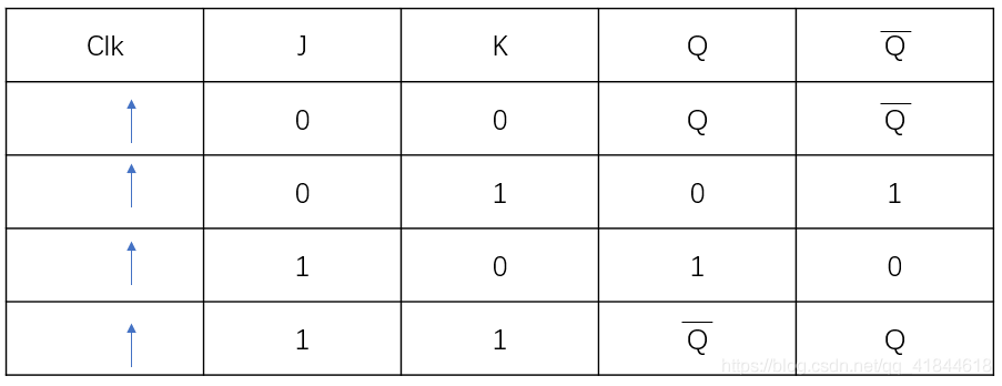在时钟上升沿信号到来时,触发器的状态将会随着J与K的输入产生相应的变化。当J=0,K=0时,触发器的状态维持不变,Qn=Qn+1.当J=0,K=1时,触发器被置成0状态,当J=1,K=0时,触发器被置成1状态,当J=1,K=1时,触发器翻转。由此可以得到触发器的特性表:
