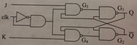 在有效时钟的脉冲边沿没到达时,即clk=0,或者clk=1,或者clk由高电平跳转到低电平,与非门G3和G4将J与K端的输入信号屏蔽,触发器状态不受输入信号的影响,维持不变。