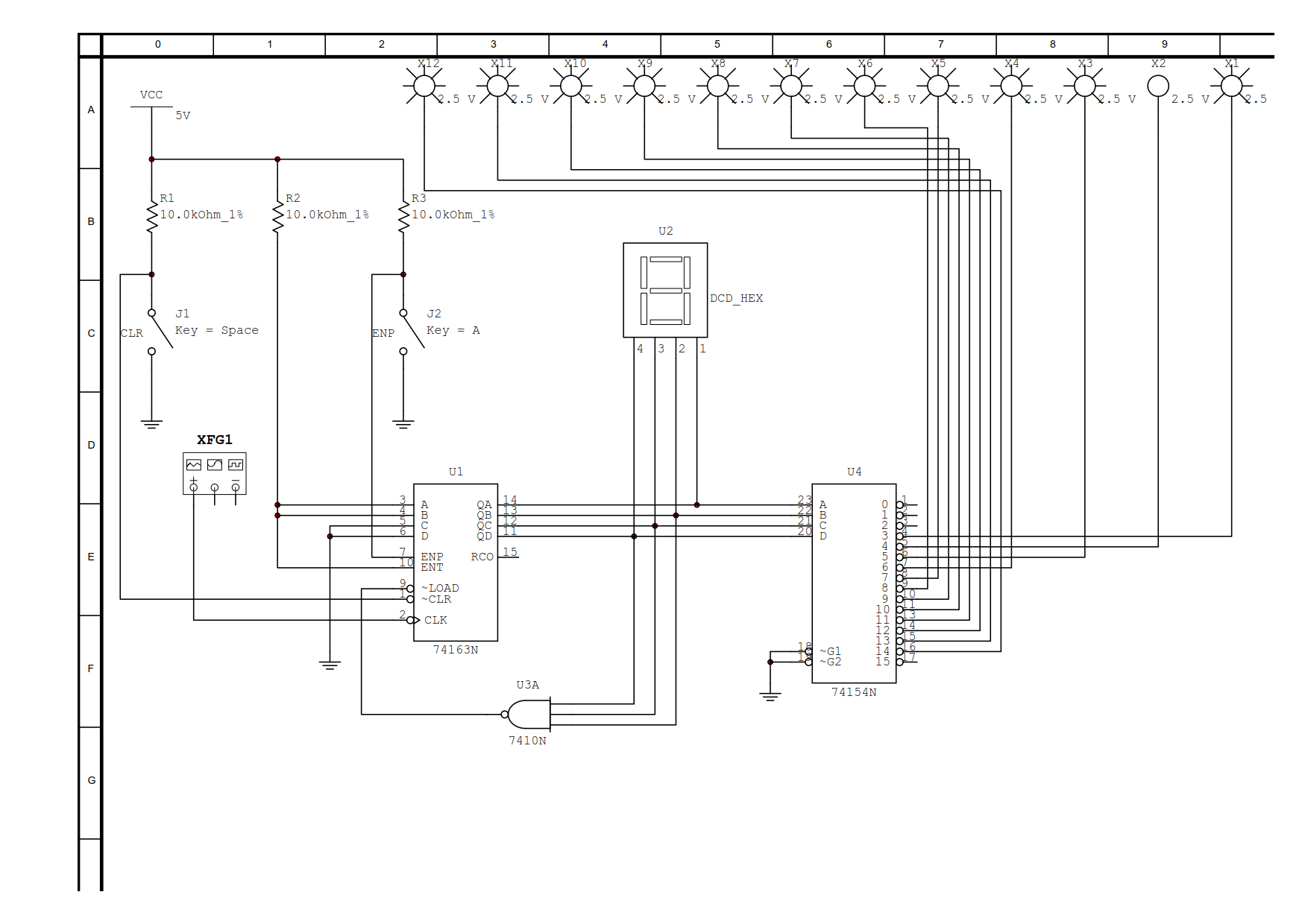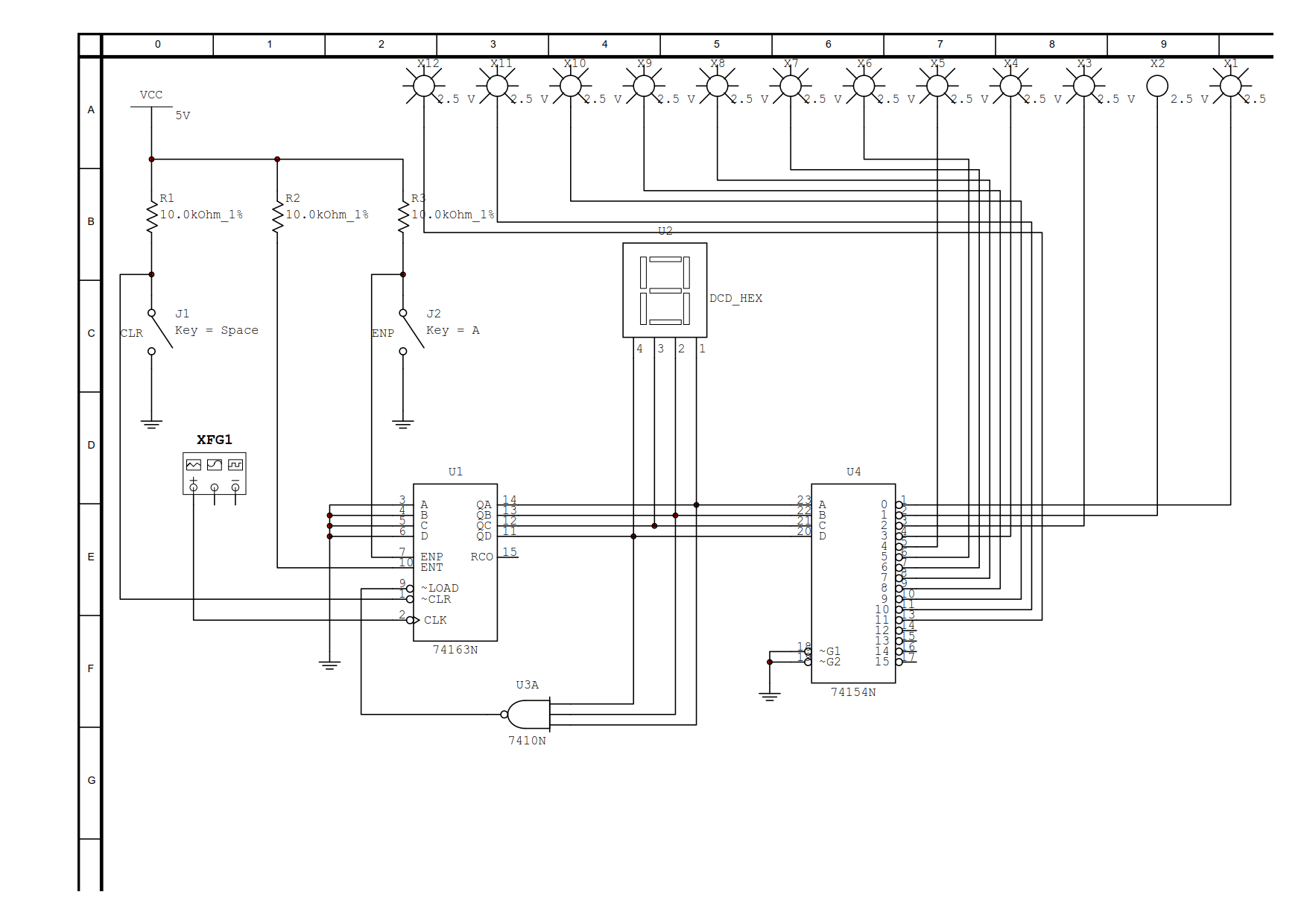 还有一个问题相信大家也有些许疑惑, 那就是为什么用16进制显示数码管的四个输入端分别接到74163的四个输出端呢, 这是因为我们可以通过16进制显示数码管的显示数字, 直观地看出74163的每个状态(0000~1011)与74154的P0~P11(共12个引脚)电平高低的对应关系.