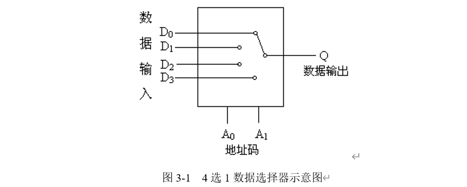 图中有四路数据D0~D3,通过选择控制信号A1、A0(地址码)从四路数据中选中一路数据送至输出端Q。