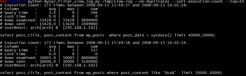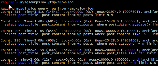 mysqldumpslow, mysql官方提供的慢查询日志分析工具. 输出图表如下: