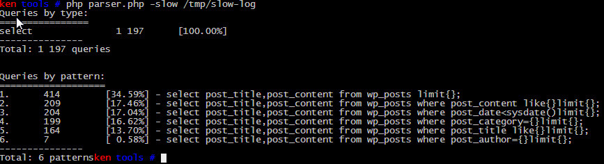 功能上, 列出了总的慢查询次数和类型, 去重后的sql语句, 执行次数及其占总的slow log数量的百分比.