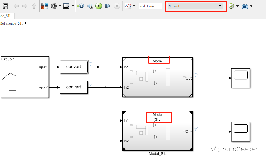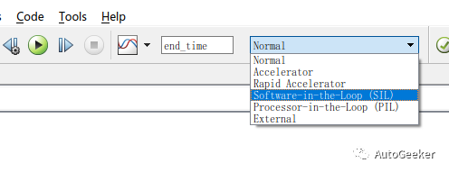 模型的Simulation Mode为Normal模式时即进行MIL测试,Software-in-the-Loop (SIL)时即进行SIL测试。
