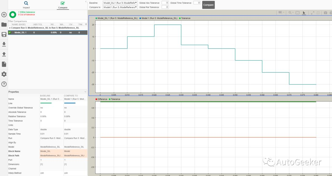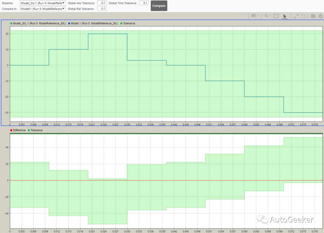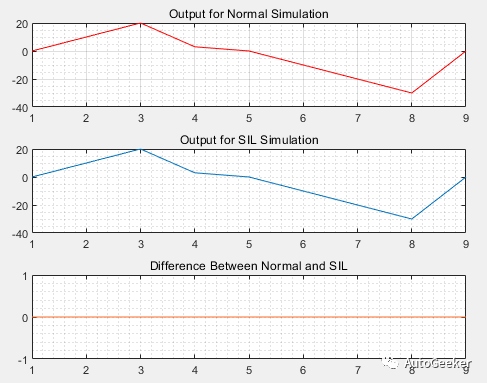 如果事先定义好一个Tolerance值,我们只要看下Difference between Normal and SIL这一结果就可以了,如果差值超过了Tolerance值,就认为SIL测试不能通过,模型与代码之间不一致。
