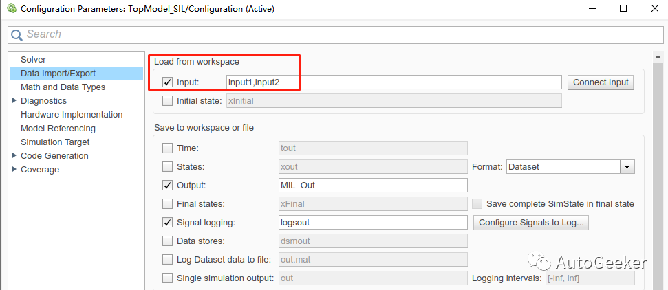 model_name = gcs;set_param(model_name,'StopTime','end_time');set_param(model_name,'SolverType','Fixed-step')set_param(model_name,'Solver','FixedStepDiscrete');set_param(model_name,'FixedStep','0.01');set_param(model_name,'SystemTargetFile','ert.tlc');set_param(model_name,'PortableWordSizes','off');set_param(model_name,'TargetHWDeviceType','Custom Processor->MATLAB Host Processor');set_param(model_name,'ProdEqTarget','off');set_param(model_name,'GenerateReport','on');set_param(model_name,'LaunchReport','off');set_param(model_name,'CodeExecutionProfiling','off');set_param(model_name,'LoadExternalInput','on');set_param(model_name,'ExternalInput',['input1,input2']);% MIL Simulation setset_param(model_name,'SimulationMode','Normal');[~,~,MIL_Out] = sim(model_name);% SIL Simulation setset_param(model_name,'SimulationMode','Software-in-the-Loop (SIL)');[~,~,SIL_Out] = sim(model_name);