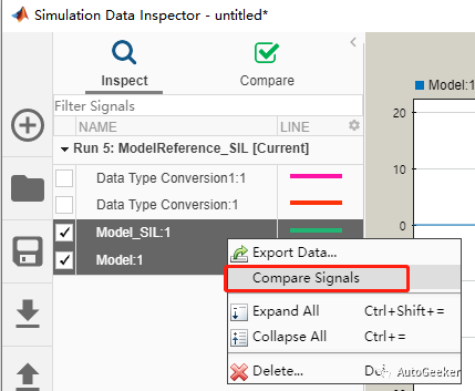 仿真结束后,打开Simulink Data Inspector,对两个输出结果进行Compare