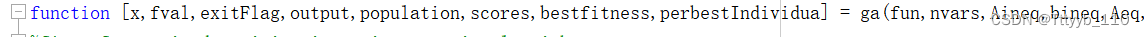 ⑤在ga内置代码中,在第②步所示的几种求解器中的返回值加上bestfitness和perbestIndividua,然后ga函数名的返回值也加上bestfitness和perbestIndividua,如图: