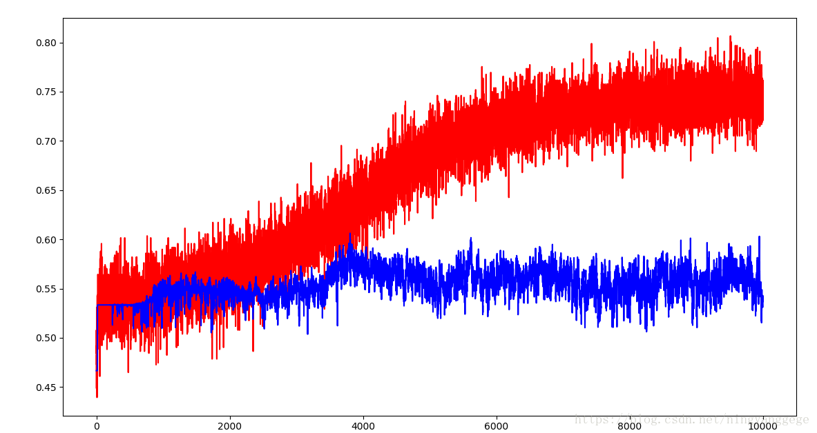 用股票的历史数据训练未来3日的预测结果时,训练了将近2000次,测试样本的准确率还是50%左右,和没有训练的结果是一样的,太伤心了;但等到10000次时,验证集的准确就突然的上升到60%;如图所示: