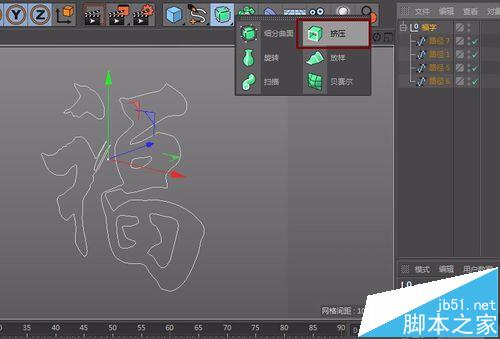 7、接下来,对导入的福字样条添加挤压,并作为样条线的父物体,勾选挤压的层级,调整其厚度就可以清楚的看到立体效果字出现了。