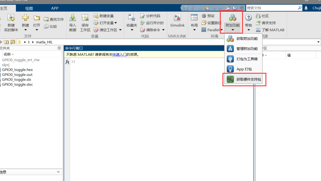 3)进去matlab之后,点击附加功能,之后点击获取硬件支持包,会弹出附加资源管理器。