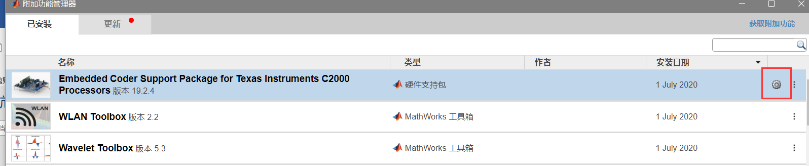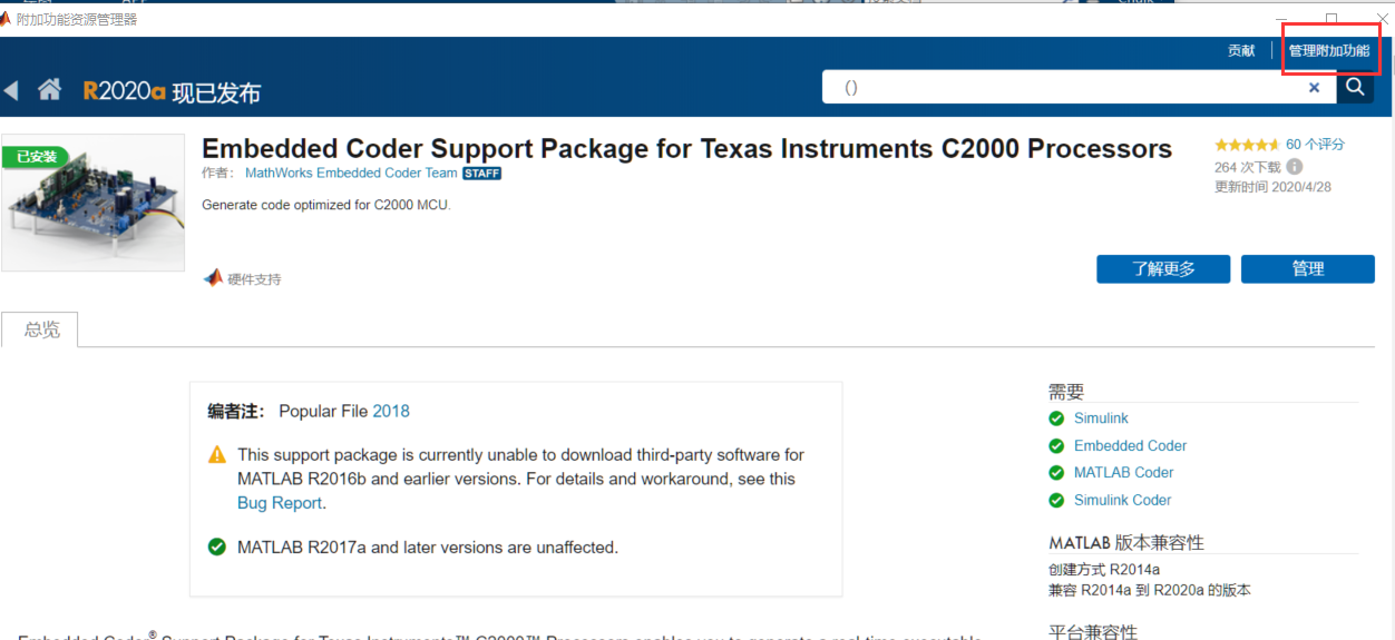 4)找到C2000的硬件支持包,进入之后,点击右上方的安装(因为我已经安装了,所以这里显示的是管理),点击安装之后,需要注册Mathwork的帐号,这个按照流程注册就行,注册完毕之后,会默认进入管理附加工具界面。