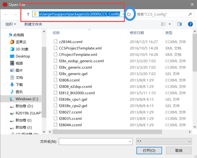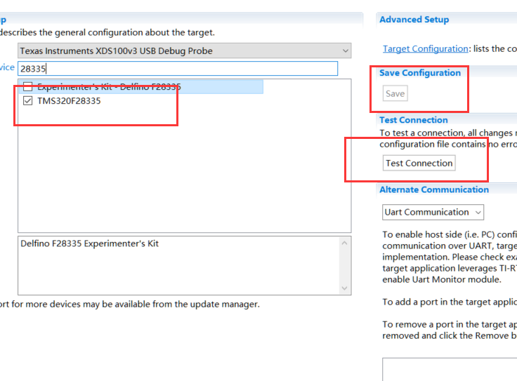 CCS hardware configuration file:选择默认路径的文件,但是需要自己去ccs中修改你的烧写器版本(100v1、100v2、100v3等等)。点击Browse复制下当前的地址,然后在CCS中File……Open File:然后输入相关路径点击转到,然后找到那个f28335.ccxml文件,修改对用的烧写器的版本(100v1、100v2、100v3等等)。然后保存,可以连接上板子进行测试一下(点击Test Connection),成功是弹出的对话框最后面会有success。