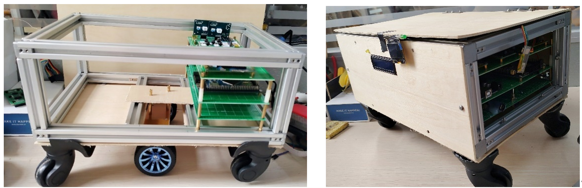 多功能智能跟随行李箱控制系统实验平台实物图如下所示,平台按照20寸行李箱的长和宽搭建,高度进行了缩减。其中,超声波传感器安装于平台正面两侧,称重传感器安装于平台后侧面四个角,UWB模块安装于平台顶面两侧位置,控制系统电路和USB双向快充模块均位于平台箱体内部,指纹传感器模块、OLED和按键安装于平台顶面以便操作。