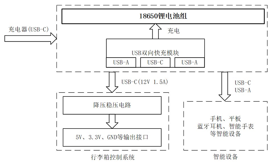 USB双向快充: 采用USB双向快充技术,通过便携式可拆卸的电源,实现为行李箱工供电的同时,可为用户的智能设备应急供电。其中快充技术的实现能够极大节省用户充电的等待时间。