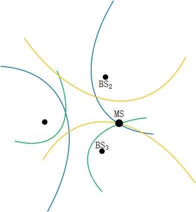 如图2.2,设基站坐标分别为(x1,y1)、(x2,y2)、(x3,y3),标签为未知坐标(x,y),基站接收到标签发出的信号的时间为t1、t2、t3,t1、t2之间的时间差为t1,2,t2、t3之间的时间差为t1,3。记MS与BS1、BS2的距离差为r1,2,MS与BS1、BS3的距离差为r1,3,MS与BS2、BS3的距离差为r2,3。根据双曲线定义,可以得到一条以BS1、BS2为焦点,以r1,2为焦距的双曲线,如上图蓝色双曲线,同理可得另外两对双曲线,三对双曲线的交点即为标签位置,进而通过计算双曲线的交点即可确定MS的坐标,可列出如下方程组: