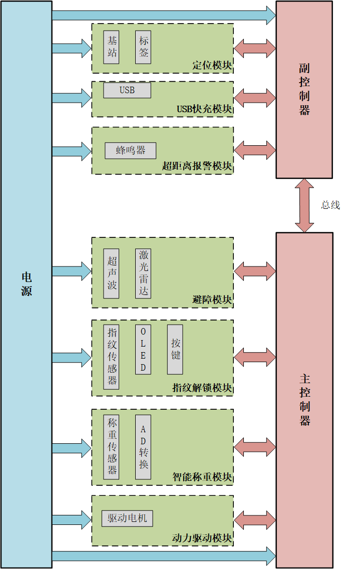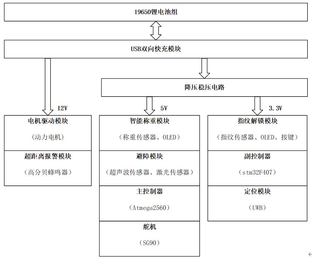 【创新点】: 1. 在自动跟随系统的设计中,对定位技术和定位跟随方法进行了对比分析,建立了行李箱运动的数学模型,设计出了一套自动跟随方法;2. 在智能跟随行李箱功能的设计中,增加了指纹解锁、自动称重、超距离报警、USB双向快充四大功能;3. 提出了分布式控制系统硬件结构方案,以提高系统的实时性和可靠性。