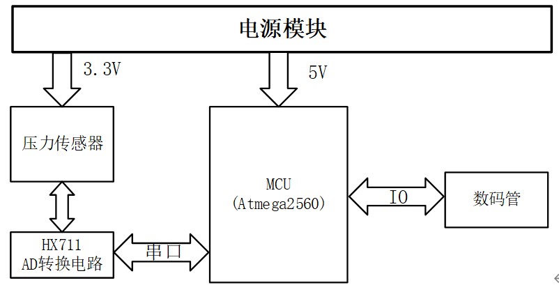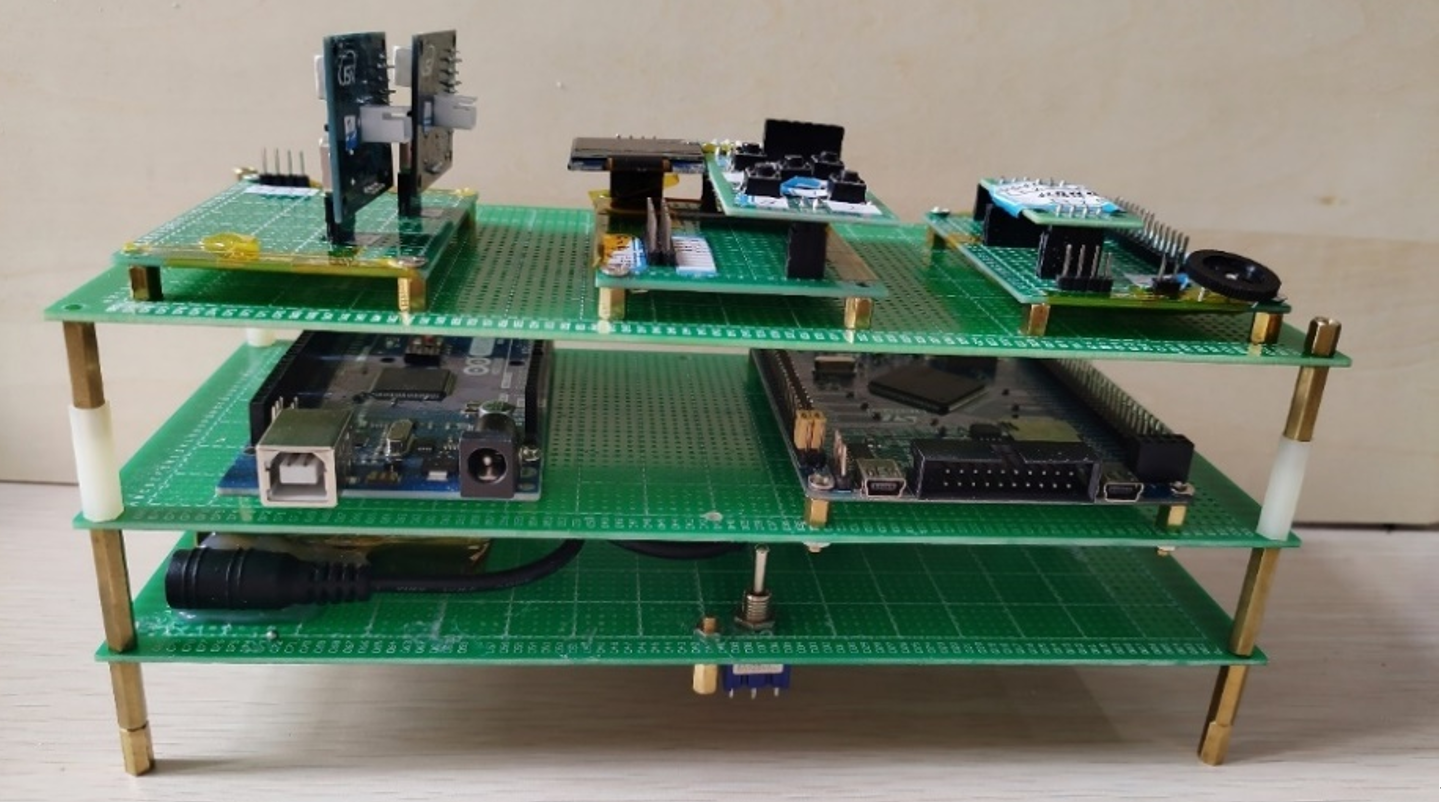 图中,下层电路为电源模块电路,中层为MCU,上层从左到右依次为超声波模块电路、指纹解锁模块电路、智能称重模块电路。