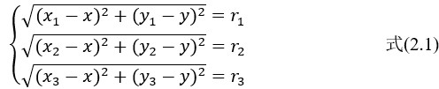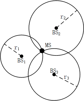 图中BS1、BS2、BS3是三个基站的位置,MS是标签的位置。设基站坐标分别为(x1,y1)、(x2,y2)、(x3,y3),标签为未知坐标(x,y),测得三个基站到MS的距离分别为r1、r2、r3。通过三边定位法计算出基站位置,在基站和标签时钟完全同步情况下,可根据以下方程计算出标签的相对坐标。