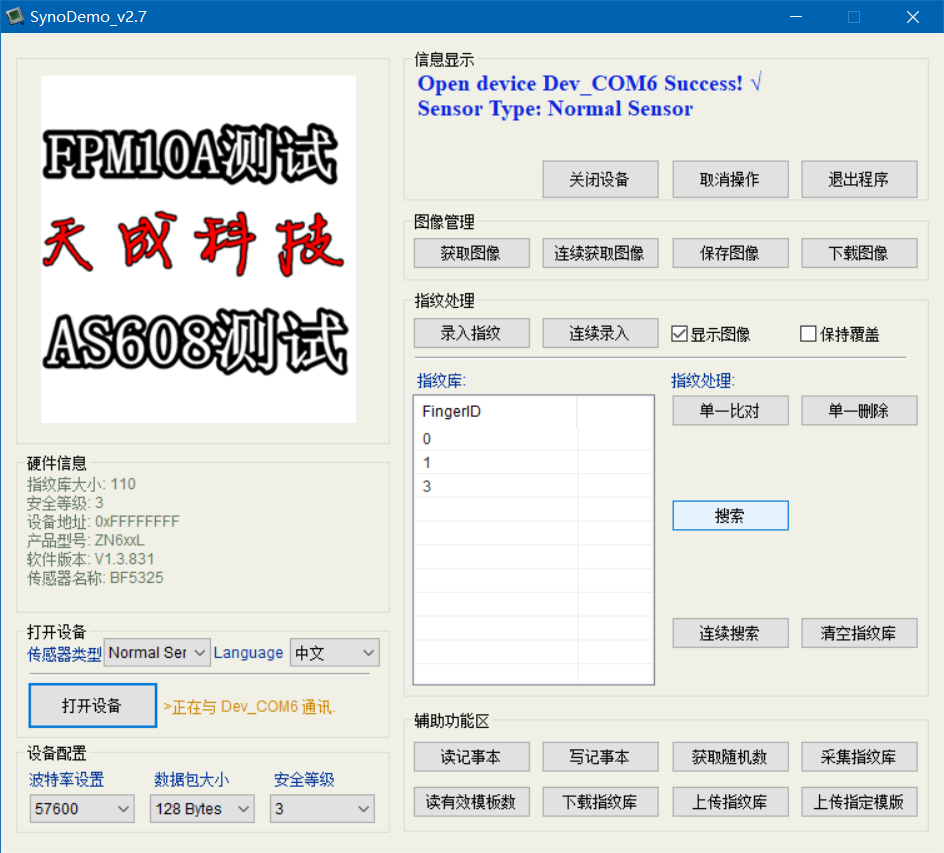 指纹模块前期调试需要用到PC上位机,将指纹模块通过USB转串口模块与计算机相连。通过计算机可以设置模块的安全等级、数据包大小、波特率等,还可查看模块参数,最主要的是进行模块调试。上位机与指纹模块通讯成功页面如下图: