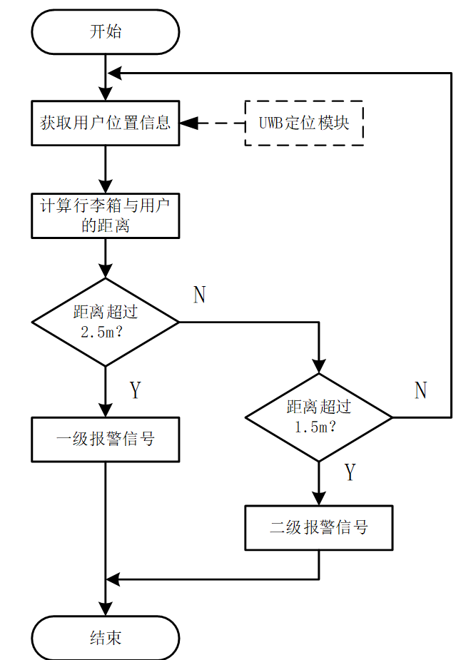 超距离报警: 以定位技术为前提,识别到行李箱距离用户超过预定的距离值后,自动产生报警信号,用以提高行李箱的安全性能。超距离报警分两个距离段,当行李箱距离用户超过1.5m时,产生一小段报警声;当距离超过2.5m时,不断产生报警声,直至距离恢复至1.5m以内。