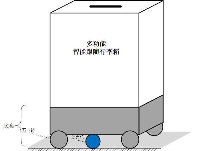 【实现功能】: 1. 定位跟随:首先通过定位技术,确定行李箱与用户之间的相对位置,进而通过自动跟随算法,驱动箱体底部的动力电机,最终达到跟随效果。2. 自动避障:利用超声波、激光雷达等测距传感器识别障碍物,进而做出躲避抉择,通过驱动箱体底部的动力电机,最终达到避障效果。3. 指纹解锁:通过光电式或电容式指纹传感器进行指纹信息的采集和识别,以指纹解锁的方式提高行李箱的安全性能。4. 自动称重:通过设计在行李箱侧面的称重传感器,自动测量行李箱及箱内物品的整体重量。5. 超距离报警:以定位技术为前提,识别到行李箱距离用户超过预定的距离值后,自动产生报警信号,用以提高行李箱的安全性能。超距离报警分两个距离段,当行李箱距离用户超过1.5m时,产生一小段报警声;当距离超过2.5m时,不断产生报警声,直至距离恢复至1.5m以内。