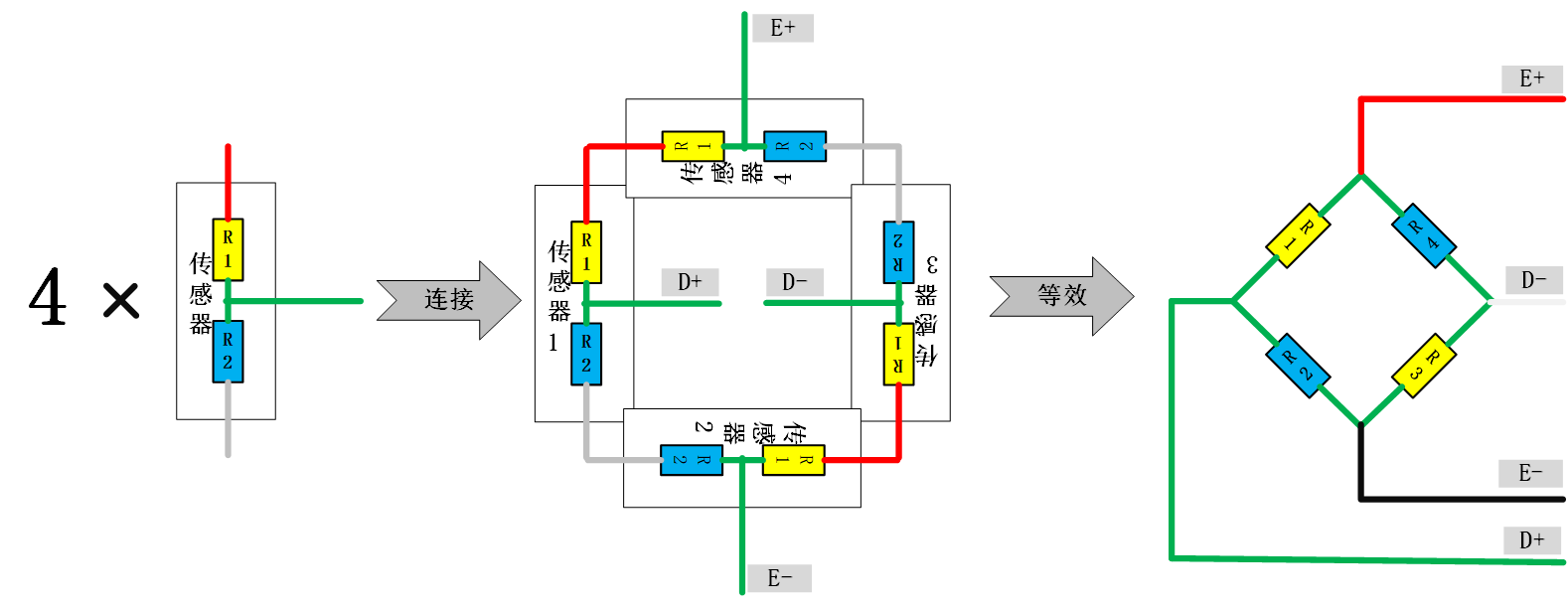 (1)将四个半桥应变传感器连接成一个全桥应变电路,对传感器施加外力,用万用表检测全桥电路的正负应变电阻的变化是否正常,排除线路问题;