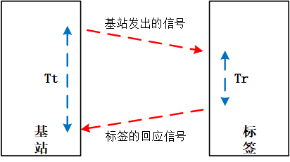 记基站发出信号到基站接收到回应信号的时间间隔为Tt,标签接收到信号到标签发出回应信号的时间间隔为Tr,则可得到信号在空中单向飞行的时间Tf = (Tt-Tr)/2,根据d =c*Tf即可计算出基站与标签之间的距离,其中c表示电磁波传播速度。坐标计算公式与TOA相似。