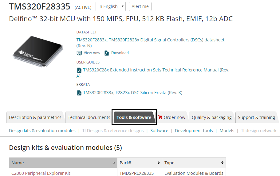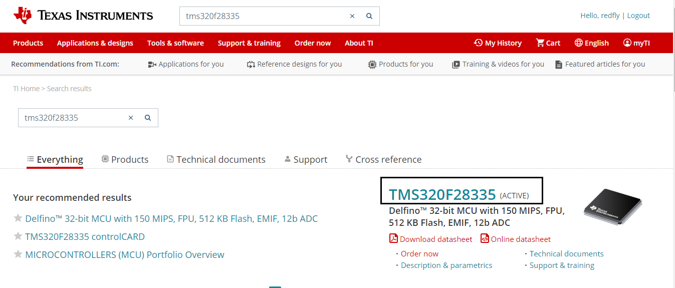 搜索tms320f28335,搜索结果的右侧点击器件进入详细页面。