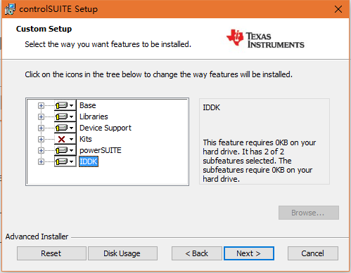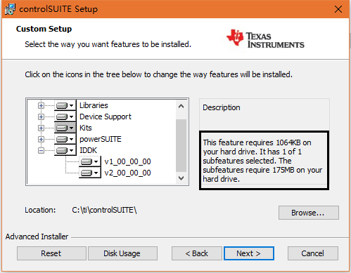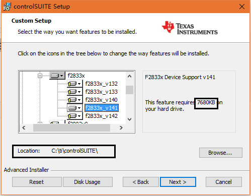 然后展开device support-f2833x,可以看到有5个版本,我们这里随便选一个,如V141。点击三角图标,选择菜单第一个:Will be installed on local hard drive。路径改不改看个人习惯,老笨一般不改,然后再看看大小对了没,以防下到其他不需要的东西,太大了就回头看看哪里没有取消。