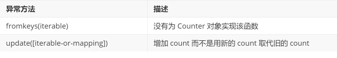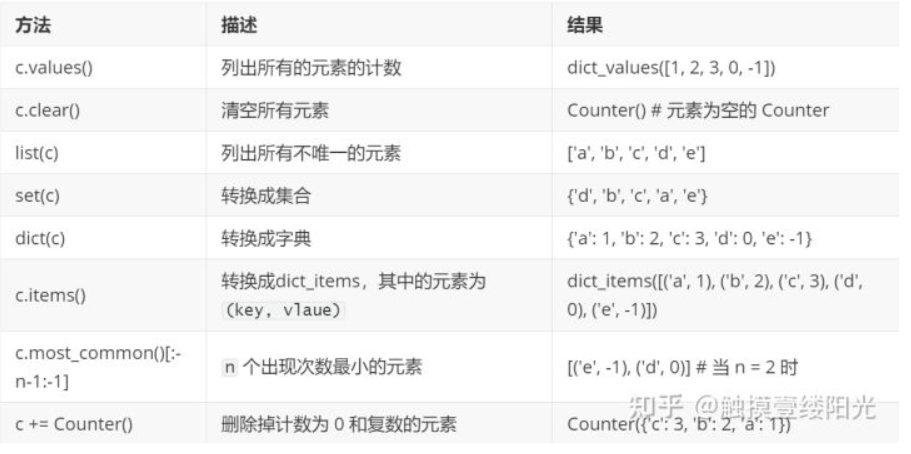 一般常规的字典方法对 Counter 对象都是有效的,将这些字典方法作用到下面的 Counter 对象c中,并绘制到下面的表格中。