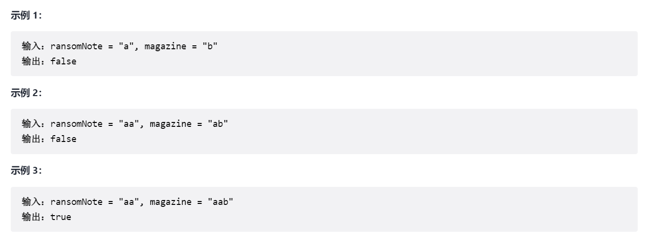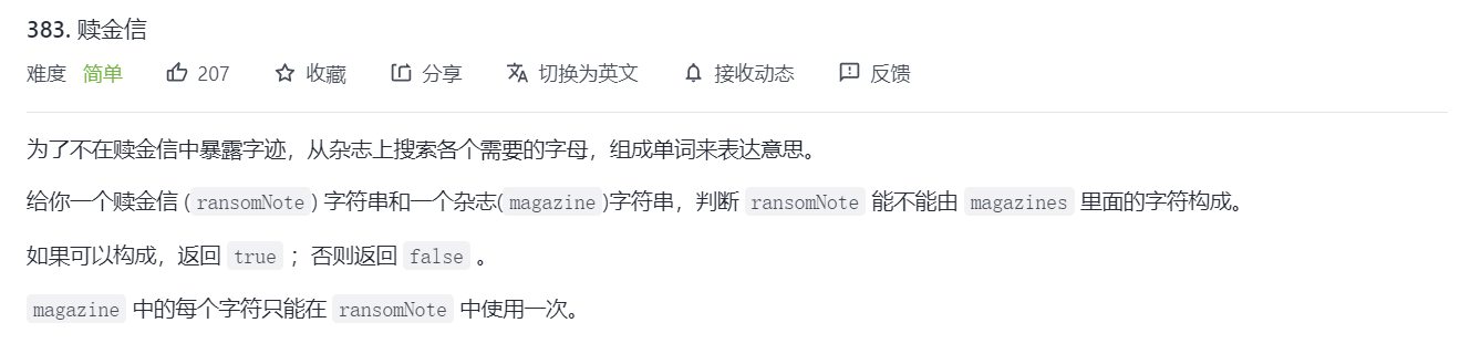 这道题是一道查找问题,查找问题非常适合使用哈希表。我的做法是使用两个循环,第一个循环将magazine中的字母存到哈希表中。第二个循环判断哈希表中的字母是否充裕,若遇到ransomNote中的字母不在哈希表中,或者该字母所对应的value值为0(已经用完),则返回False。循环如果能正常结束,则代表满足条件,返回True。
