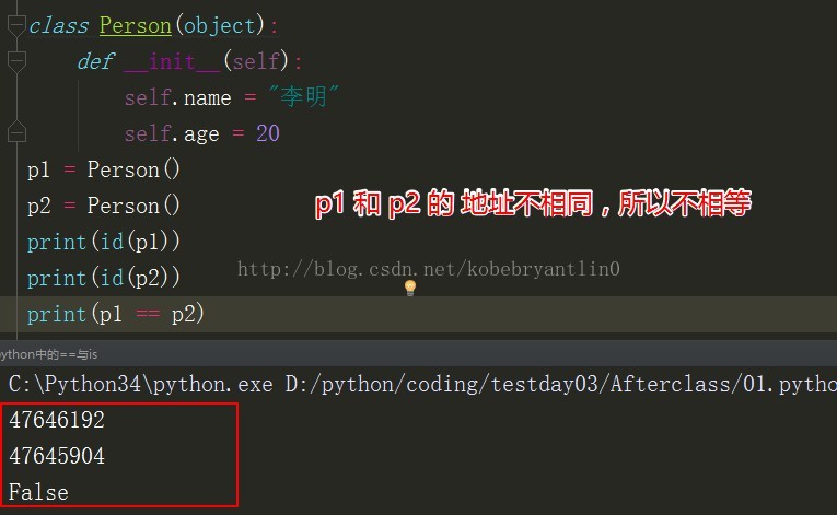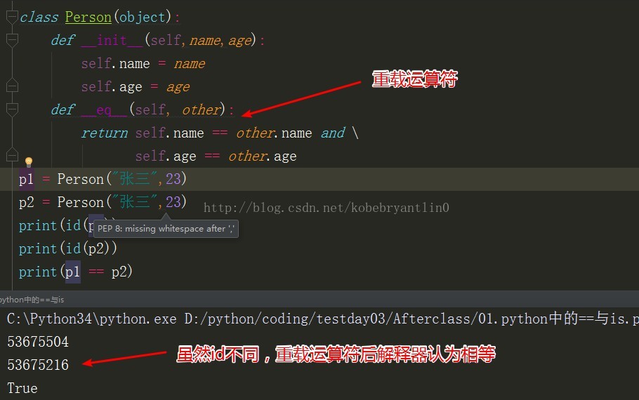 我们发现上图中,p1和p2两个对象的内容完全相同,但是python编译器却认为其不相等,这个时候就需要我们自己去定义规则去规定在什么条件下两个对象是相等的,具体操作需要去重写python中的__eq__方法,通常把这个过程叫做运算符重载。下面这张图就是完成运算符重载之后的操作,我们发现这时候两个对象的值是相等的。