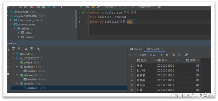 - 从“选修”表中查询各同学的成绩信息,并按照学号的升序排序,必须包含实验者个人的成绩信息。