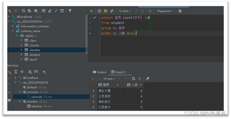 - 从“学生”表中查询不同籍贯地的人数并按照人数多少排序。