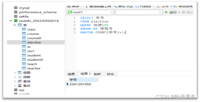 - 从“选修”表中查询至少有3门以上课程成绩在85分以上的学生学号,必须包含实验者个人的成绩信息。