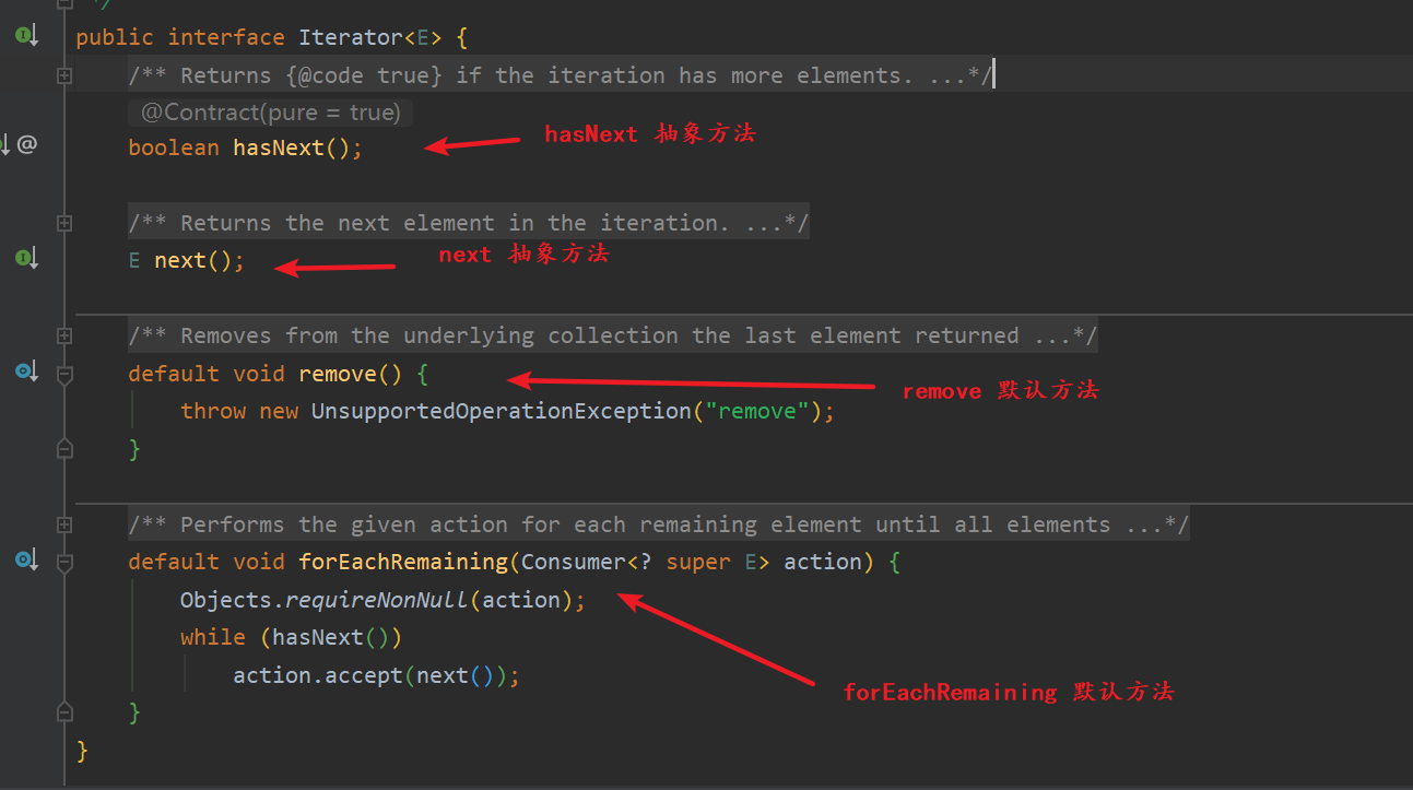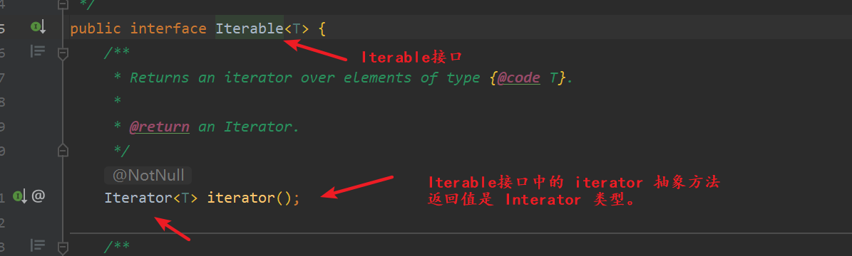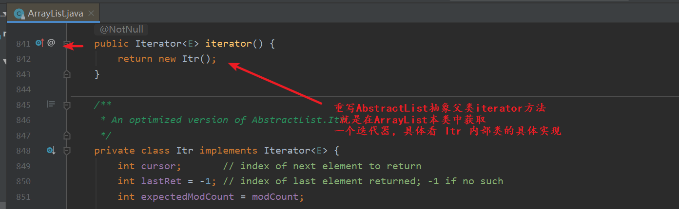 - 而 iterator 是Iterable 接口中的 一个抽象方法:Iterator 是 Iterable 接口的 iterator 抽象方法的返回值。 由 AbstractList抽象父类进行了实现了 iterator方法,AbstractList的 Itr 内部类实现了 Iterator接口。只有ArrayList进行了重写,ArrayList中 Itr 内部类重写实现了 Iterator接口。