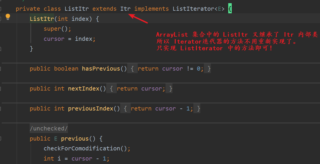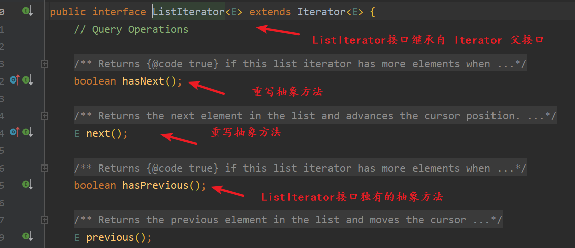 - ListIterator 是 Iterator 接口的子接口。listIterator 方法是 集合们的抽象父类 AbstractList中的方法,由它里面的 ListItr 内部类实现了 ListIterator 接口。 ArrayList重写了有参和无参的 listIterator 方法,并且ArrayList 中的 ListItr 内部类 继承了 Itr 内部类并重写实现了 ListIterator 接口 ,LinkedList 只重写了 有参的 listIterator 方法,并且 LinkedList 中的 ListItr 内部类重新实现了ListIterator接口。