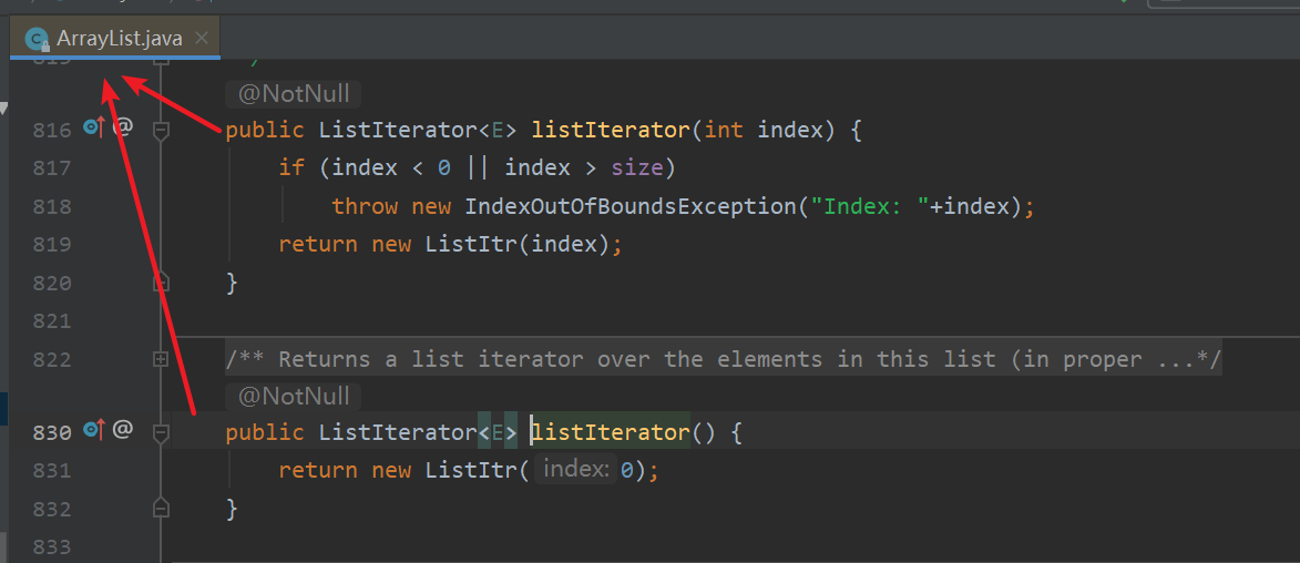 ArrayList和LinkedList的共同抽象父类定义的listIterator方法: