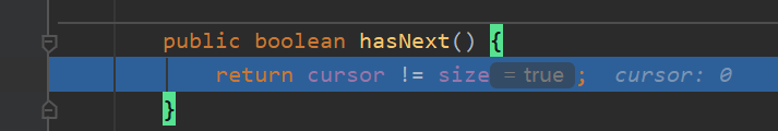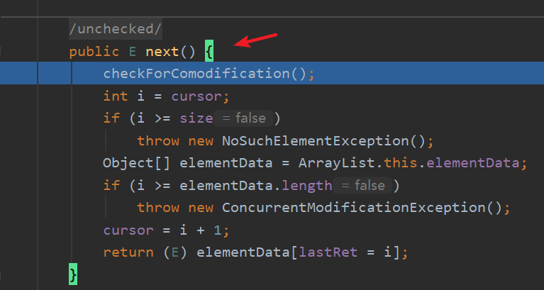 private class Itr implements Iterator<E> { /** * cursor : 光标、指针, * 由cursor变量模拟一个指针,初始化值 0 */ int cursor; // index of next element to return /** * 返回的最后一个元素的索引 */ int lastRet = -1; // index of last element returned; -1 if no such /** * expectedModCount:预期的操作数, * 由 modCount 的值 赋值初始化, * 这个modCount在 AbstractList 抽象父类中, * ArrayList继承自AbstractList 可以直接使用 * 它记录的就是当前集合的 增、删 操作的 次数。 */ int expectedModCount = modCount; /** * 无参构造器 */ Itr() {} /** * 是否有下一个元素 * @return 比较结果 */ public boolean hasNext() { /** * 如果 指针 不等于 集合的长度。 * 也就是ArrayList底层数组的实际长度 */ return cursor != size; } /** * 获取下一个元素 * @return 当前遍历的元素 */ @SuppressWarnings("unchecked") public E next() { // 检查 当前迭代器的操作的次数。 checkForComodification(); // i 初始值 为 cursor,第一次为 0 int i = cursor; // 如果 i 大于等于 当前集合的长度。一般遍历完再调用迭代器的 next 方法就会抛出 // 抛出 没有这样的元素 异常 if (i >= size) throw new NoSuchElementException(); /* 把ArrayList的elementData数组 赋值给 当前Itr 内部类的 elementData 让它指向。*/ Object[] elementData = ArrayList.this.elementData; // 如果 i 大于等于 数组的长度。也就是 和 size 是一样的值。 // 则抛出 并发修改 异常 if (i >= elementData.length) throw new ConcurrentModificationException(); // 指针等于 i + 1 cursor = i + 1; // 先把 i 的值赋值为 lastRet,第一次i的值为0, // 再返回数组中的元素 return (E) elementData[lastRet = i]; } /** * 删除元素 */ public void remove() { // 如果lastRet小于 0, // 则抛出 非法状态异常 // 这也是为什么要先 next 再remove 的原因! // 底层代码已经写死了的! if (lastRet < 0) throw new IllegalStateException(); // 检查当前迭代器操作数组的次数! checkForComodification(); try { // 调用 ArrayList 的remove方法删除元素 // 第一次 lastRet 由 i 赋值为 0 ArrayList.this.remove(lastRet); // 指针的 值 为 lastRet,第一次为 0 // 如果 一直remove 则,lastRet的值一直都是为 0 cursor = lastRet; // lastRet 的值 Remove 一次就置为 -1, // 从而和 next 方法形成了闭环 lastRet = -1; // expectedModCount:预期的操作数,又置为 modCount // 需要清楚的是,每次 迭代器的remove 方法 // 调用ArrayList 的remove方法时。 // 在ArrayList中的 modCount 记录的增、删操作的次数都会 ++ // 迭代器中的remove方法让 expectedModCount // 保持了 和 modCount 同步的操作,索引不会造成 并发修改异常! expectedModCount = modCount; // 即如果使用迭代器遍历操作完之后,又在迭代器的外部使用了 remove 方法 // 的话则 捕获索引越界异常 改抛 并发修改 异常! } catch (IndexOutOfBoundsException ex) { throw new ConcurrentModificationException(); } } @Override @SuppressWarnings("unchecked") public void forEachRemaining(Consumer<? super E> consumer) { // 如果 调用方法传入进来的 consumer 对象为null // 则抛出 空指针 异常 Objects.requireNonNull(consumer); // 获取当前集合的大小 final int size = ArrayList.this.size; // 初始i等于 cursor ,第一次 为 0 int i = cursor; // 如果 i 大于等于集合大小,结束方法 if (i >= size) { return; } // 获取当前集合的 elementData数组让 当前迭代器的 elementData数组指向。 final Object[] elementData = ArrayList.this.elementData; // 如果 i 大于等于 数组长度 则抛出 并发修改异常 if (i >= elementData.length) { throw new ConcurrentModificationException(); } // 进入 while 循环,条件是 i(cursor) 不等于 集合大小 且 // 集合操作的增、删的次数始终都 等于 当前迭代器操作的次数 while (i != size && modCount == expectedModCount) { // 调用 Consumer 接口的实现类的 // accept (接收)方法,返回当前 数组中的对应索引的 // 元素给 实现类使用! // 然后 i再 ++ consumer.accept((E) elementData[i++]); } // update once at end of iteration to reduce heap write traffic // cursor 等于当前 的 i。 cursor = i; // lastRet 等于当前的 i - 1 lastRet = i - 1; // 遍历完之后,再检查是否 并发修改!如果在使用 forEachRemaining // 遍历时有对集合中元素增、删的操作时,则抛出并发修改异常! checkForComodification(); } final void checkForComodification() { // 出现这个异常的情况一般都是 一边删除集合中的元素,一边又往集合中添加元素 // 或者一边调用 迭代器的 remove方法, // 一边又调用 ArrayList 集合中增、删 的方法! // 因为 modCount 和 expectedModCount 不是迭代器一个 // "人" 在操作,没有进行同步,所以抛出并发修改异常! // 则抛出 并发修改 异常 if (modCount != expectedModCount) throw new ConcurrentModificationException(); } } // ListItr 继承自 Itr(Iterator 迭代器实现类,所以可以直接使用Itr中实现的方法!) // 实现自 ListIterator(列表迭代器)(ListIterator是Iterator的子接口!) private class ListItr extends Itr implements ListIterator<E> { // 有参构造器, // 用户传入的索引, // 赋值给 cursor 属性。(这个属性继承自 Itr 父类) // 如果用户没有传入索引 // cursor 默认初始化值为 0 ListItr(int index) { super(); cursor = index; } /** * * @return 是否有上一个元素! * 此方法可以用于逆向遍历! * 此方法只有在正向遍历完之后,才可以逆向遍历! */ public boolean hasPrevious() { return cursor != 0; } /** * * @return 返回下一个元素的索引 */ public int nextIndex() { return cursor; } /** * * @return 返回上一个元素的索引 */ public int previousIndex() { return cursor - 1; } // 返回上一个索引的元素 @SuppressWarnings("unchecked") public E previous() { // 