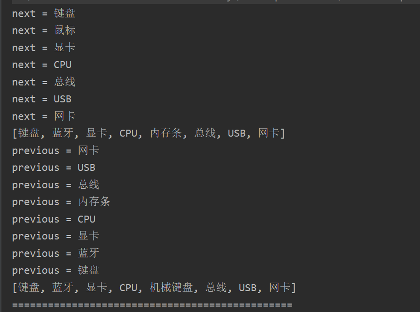 public static void listIterator() { List<String> arrayList = new ArrayList<>(); arrayList.add("键盘"); arrayList.add("鼠标"); arrayList.add("显卡"); arrayList.add("CPU"); arrayList.add("总线"); arrayList.add("USB"); arrayList.add("网卡"); listUseListIterator(arrayList); System.out.println("==============================================="); listUseListIterator(new LinkedList<>(arrayList)); } public static void listUseListIterator(List<? super String> list) { // 如果是使用 Iterator 迭代器的时候, // 如果想一边遍历,一边调用ArrayList、LinkedList 集合的增、删的API的话 // 就会抛出 ConcurrentModificationException!! Iterator<? super String> iterator = list.iterator(); // while (iterator.hasNext()) { // // 如果下一个元素为 "CPU" 就在它的后面添加 内存条 词条 // // 再把 "网卡" 给删除掉 // /* 抛出: java.util.ConcurrentModificationException 并发修改异常!*/ // if ("CPU".equals(iterator.next())){ // arrayList.add("内存条"); // arrayList.remove("网卡"); // } // } // 获取 ListIterator 迭代器 ListIterator<? super String> listIterator = list.listIterator(); // 而使用 ListIterator 迭代器就可以 // 一边遍历、一边增加、或删除 集合中的元素 // 前提是 必须使用 ListItr (ArrayList的内部类) // 实现自 ListIterator 接口的API, // 如果是使用的 ArrayList 、LinkedList 的API的话, // 那么操作次数不同步,一样的会抛出 // ConcurrentModificationException!! while (listIterator.hasNext()) { String next = (String) listIterator.next(); // 如果下一个元素为 "CPU" 就在它的后面添加 内存条 词条 if ("CPU".equals(next)) { listIterator.add("内存条"); } // 如果 下一个元素 为 "鼠标" 的话,就把 它修改为 蓝牙 if ("鼠标".equals(next)) { listIterator.set("蓝牙"); } System.out.println("next = " + next); } System.out.println(list); // 还可以 逆向遍历(必须在正向 遍历完之后才可以!) while (listIterator.hasPrevious()) { String previous = (String) listIterator.previous(); // 如果 上一个 元素是 内存条 的话就修改为 机械键盘 if ("内存条".equals(previous)) { listIterator.set("机械键盘"); } System.out.println("previous = " + previous); } System.out.println(list); }result: