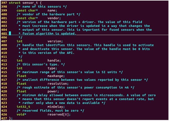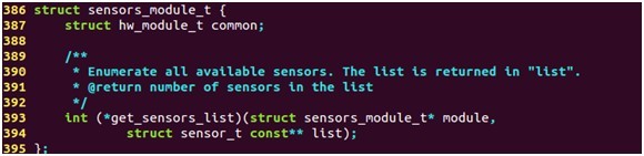 该接口的定义实际上是对标准的硬件模块hw_module_t的一个扩展,增加了一个get_sensors_list函数,用于获取传感器的列表。