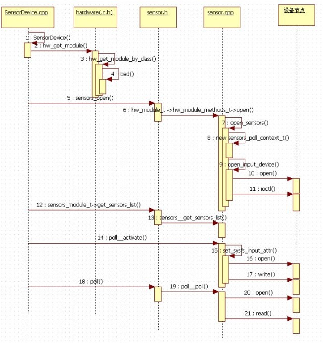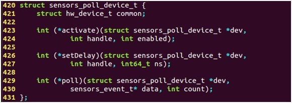Sensor设备结构体sensors_poll_device_t,对标准硬件设备 hw_device_t结构体的扩展,主要完成读取底层数据,并将数据存储在struct sensors_poll_device_t结构体中,poll函数用来获取底层数据,调用时将被阻塞定义如下: