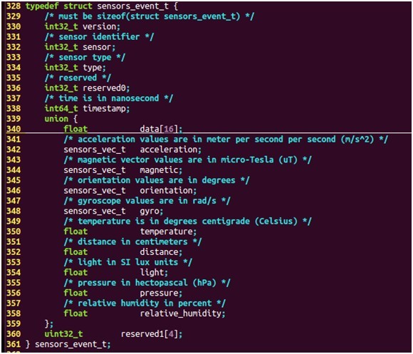 每个传感器的数据由sensors_event_t结构体表示,定义如下: