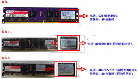 其实分辨真伪威刚内存十分简单。拿到一款威刚内存产品首先通过肉眼观察,从内存贴纸上的防伪电话到外包装的设计,真假产品都能看出不同。首先从防伪标识和防伪电话说起,威刚“万紫千红”系列内存整个PCB板以紫色为主,电路板中间有V—DATA的烫金标志,内存颗粒上贴有V—DATA的红色条码贴纸和威刚科技的防伪贴纸,防伪贴纸上标明了查询电话和网站地址以及可刮开图层的防伪码。威刚“红色威龙”在绿色PCB板层外加装了红色的散热片,散热片正面贴有激光条码贴纸,背面则是防伪贴纸。如果从外观上无法区分真假,那么防伪贴纸上查询电话和可刮开的防伪码则能帮您彻底的弄清产品的真伪。
