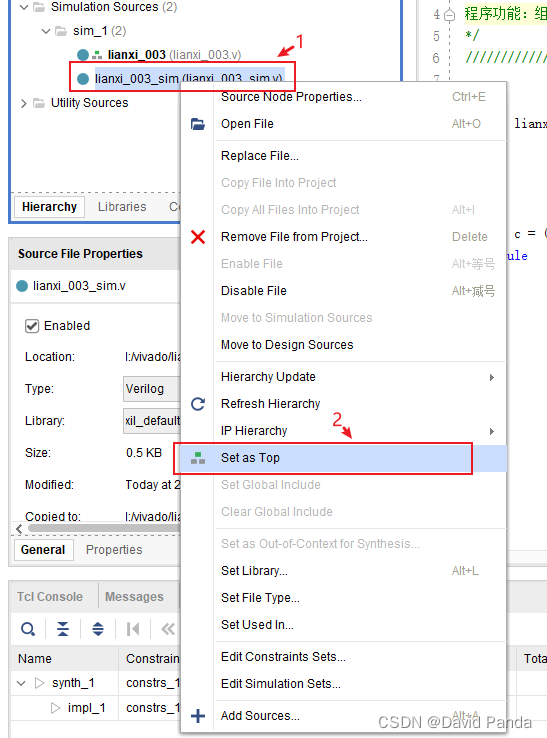 ⑥将新建的仿真文件“lianxi_003_sim”设置成顶层。